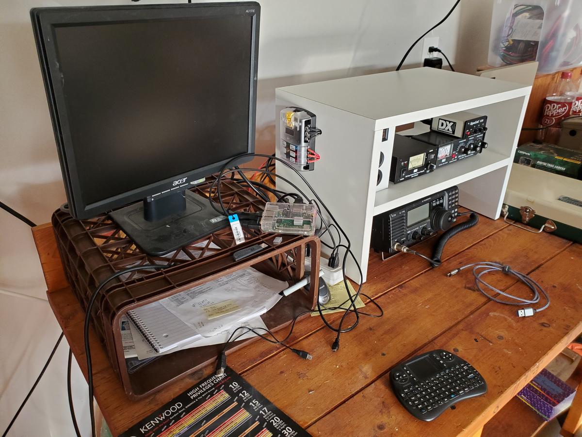 The only difference between the picture shown here and the shack as it is right now, is the addition of a few items. There's now a dual band Alinco mobile and a CB radio hooked up, along with two mag mount antennas and a ground bar hooked up to the outlet behind(not ideal, I know).